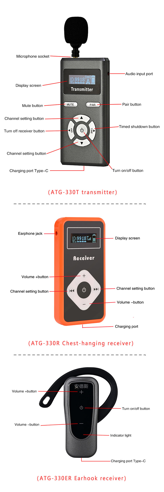 Earhook wireless tour guide system ATG-330